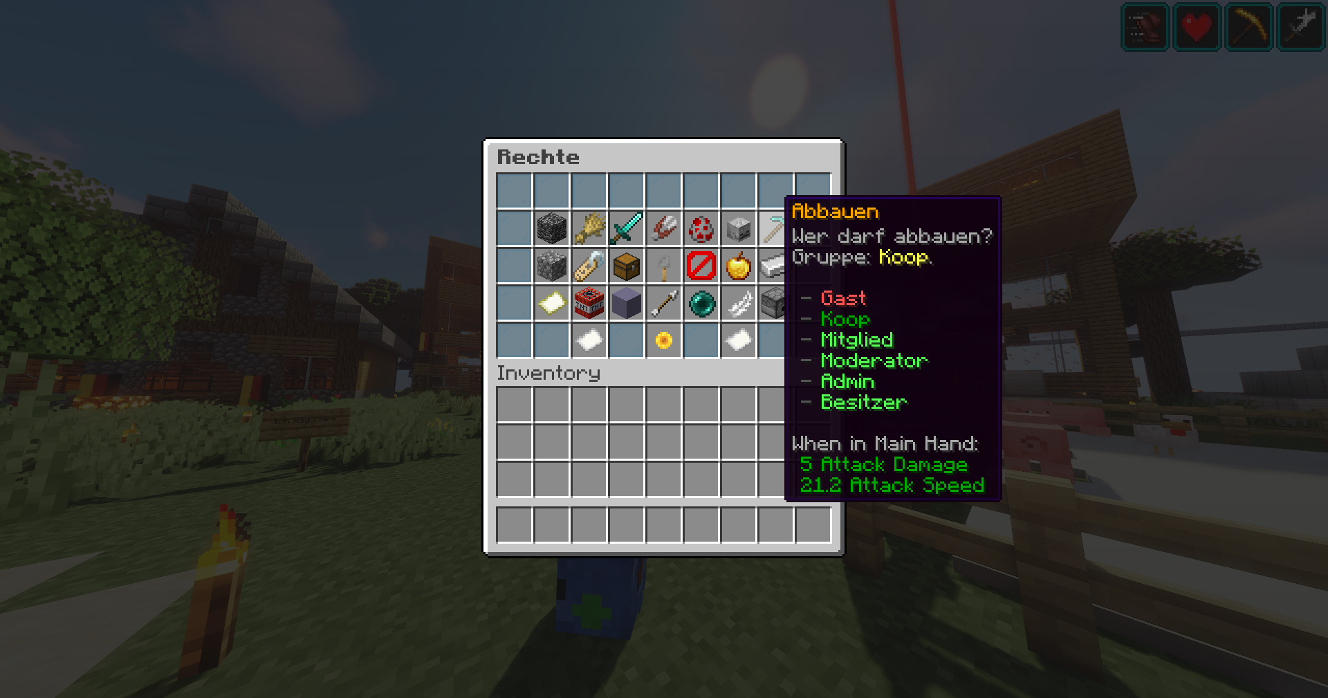 Ein weiterer Vorteil unseres Inselsystems ist es, dass Spieler für ihre Inseln individuelle Rechte ⁴ einstellen können für Gäste, Koops, Mitglieder, Moderatoren und Admins. Grün bedeutet jeweils, dass das jeweilige Recht für die grün-markierten Gruppen gestattet ist. Rot steht für das Gegenteil, das jeweilige Recht ist für die rot-markierten Gruppen nicht gestattet. Ändern kann man das mit einem Linksklick auf das angezielte Recht.