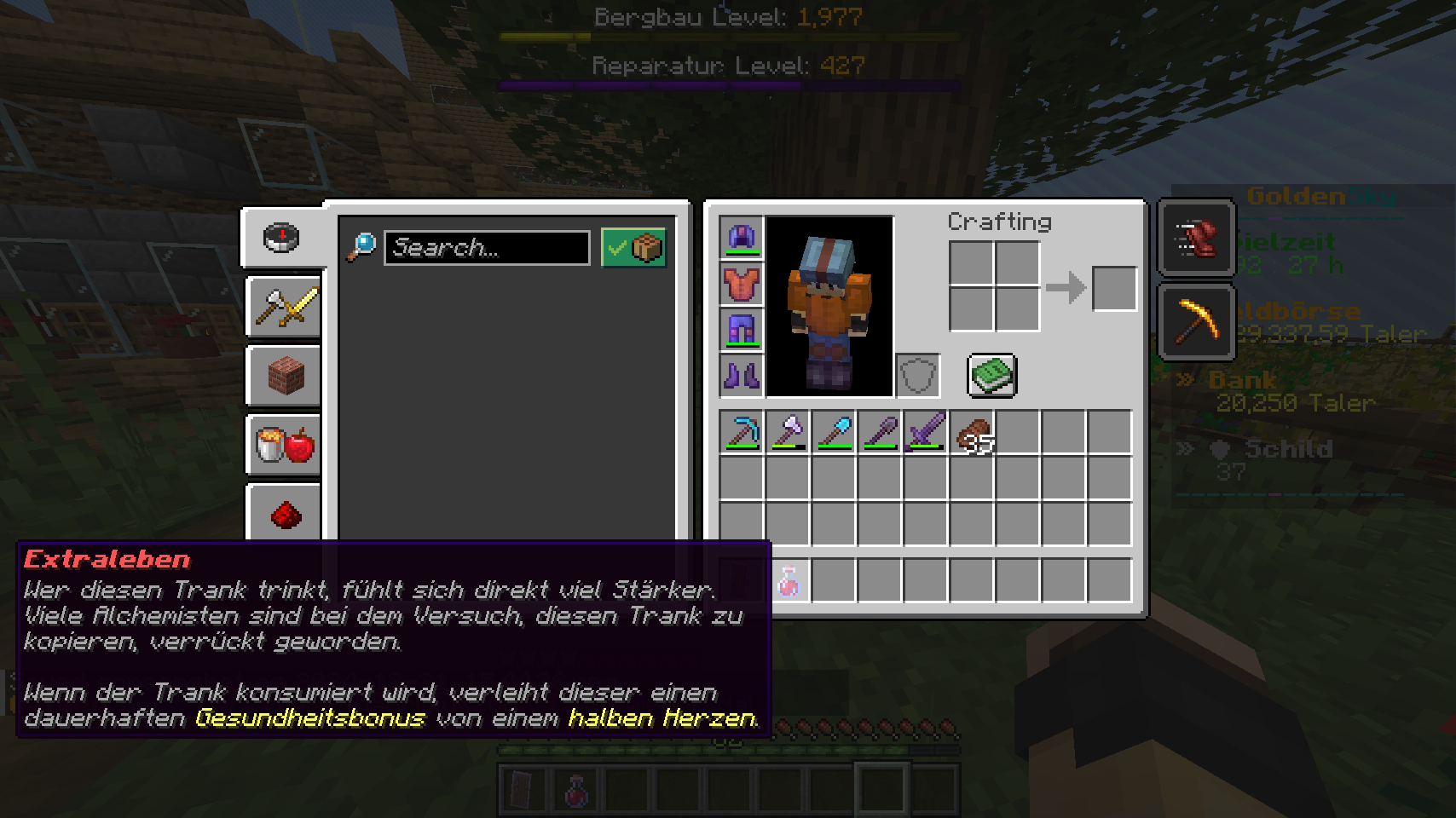 Herzen (oder Extra-Herzen) sind wertvolle Lebensboni, die deine Überlebenschancen massiv erhöhen. Standardmäßig beginnt jeder Spieler mit 10 Herzen (20 Leben), doch durch spezielle Tränke kannst du diese auf bis zu 30 Herzen steigern. In Kombination mit Schilden kann diese Erweiterung deine Widerstandsfähigkeit gegenüber feindlichen Mobs deutlich verstärken. Extra-Herzen lassen sich aus Schatzkisten ziehen, als Eventbelohnung erhalten oder im WebShop für Echtgeld kaufen.