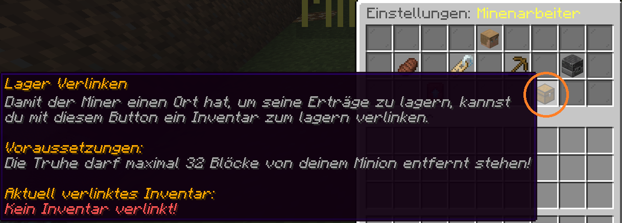 Über die Schaltfläche des Minions lassen sich Kisten verlinken. Minions werden die gefarmten Items in die Kiste legen. Das Verkäufer-Minion kann die Items aus der verlinkten Kiste verkaufen, und das Versorger-Minion kann andere Minions mit Nahrung aus dieser Kiste versorgen.