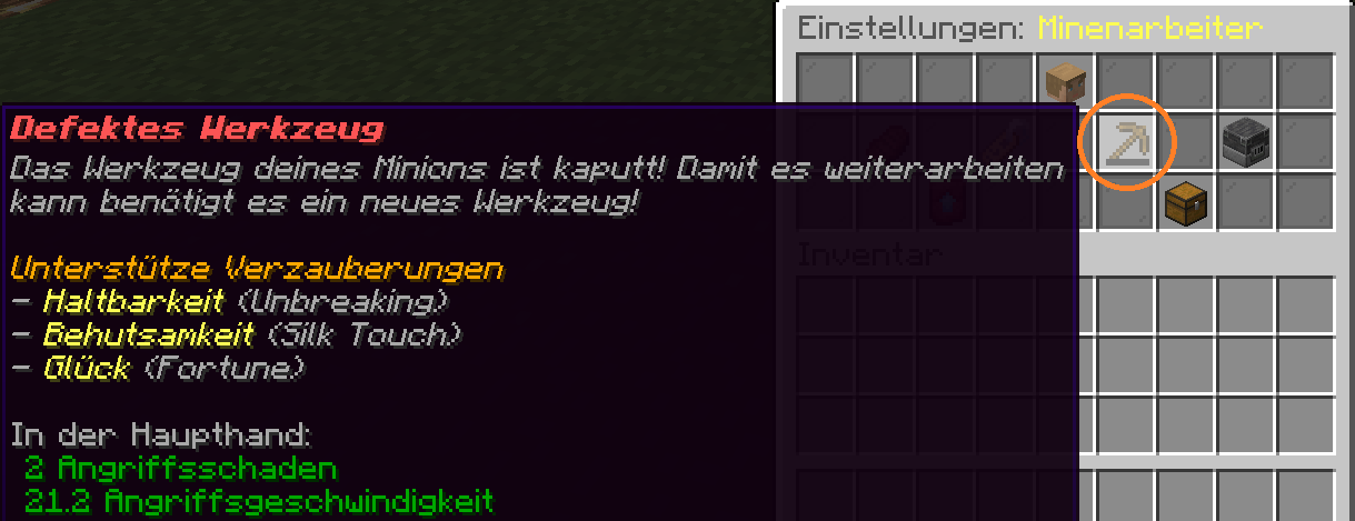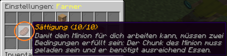 Minions benötigen Nahrung um zu arbeiten. Über die Schaltfläche kann man sehen, wie viel Nahrung ein Minion noch hat. Um das Minion zu füttern reicht ein Rechtsklick mit der Nahrung in der Hand auf den Minion.