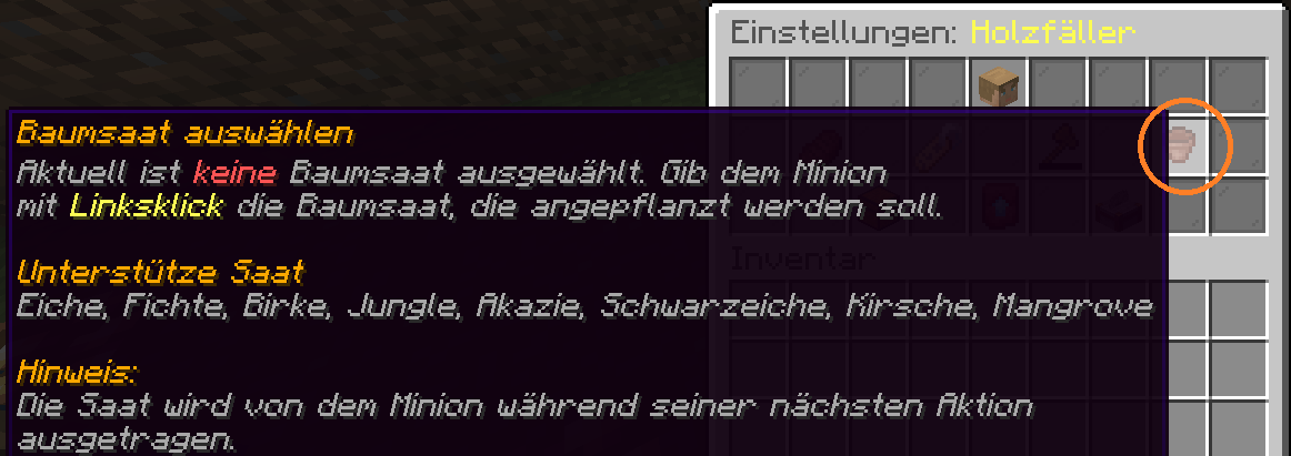 Der Farmer sowie der Holzfäller müssen außerdem einmalig mit Setzlingen / Saat ausgestattet werden, damit sie arbeiten können. Die Saat / Baumart kann man jederzeit ändern.
