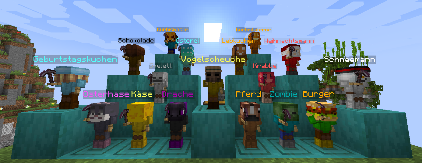 Mit Skins kann man das Aussehen des Minions verändern. Diese kann man über die Schaltfläche des Minions wählen. Der Standard-Skin hat den Kopf des Besitzers.